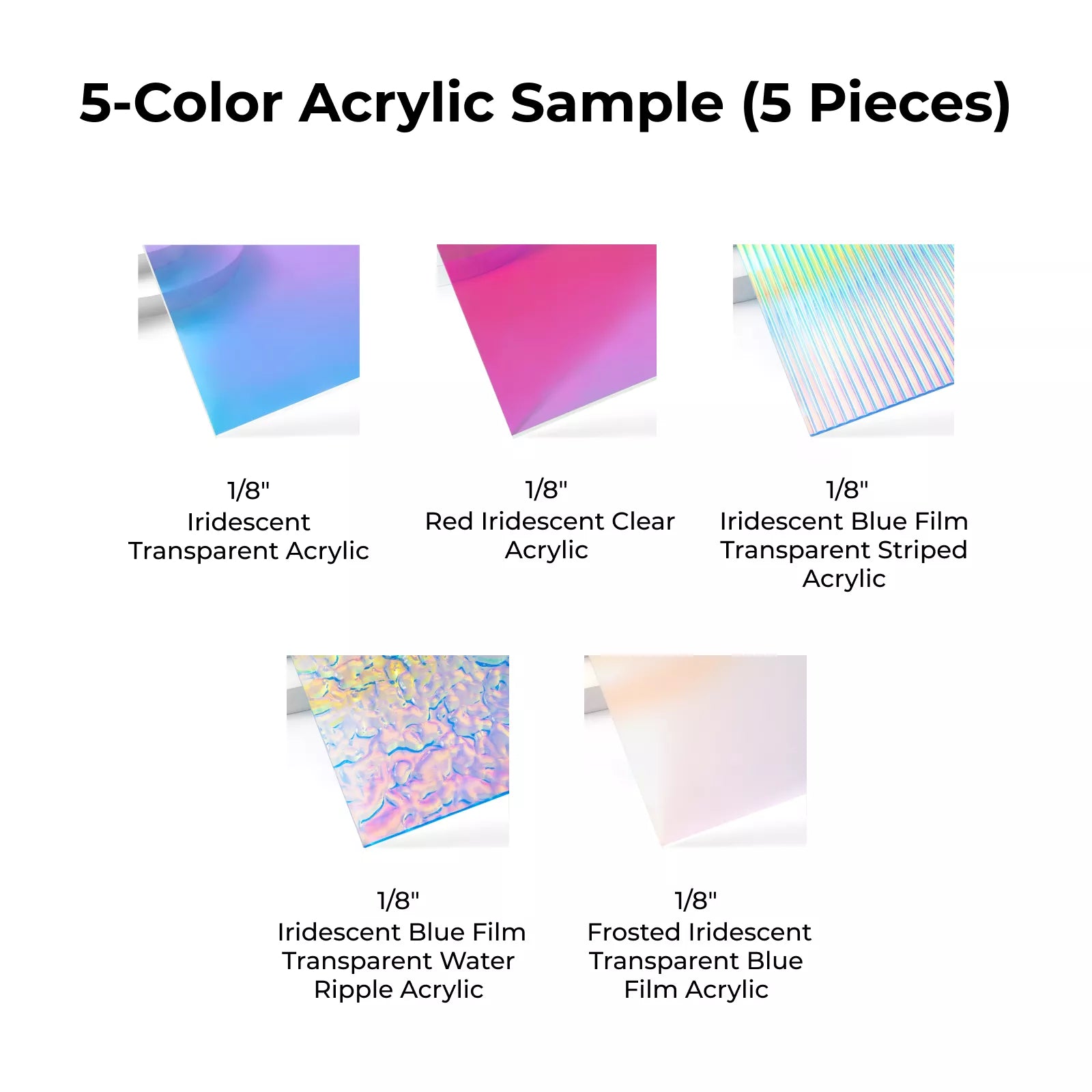 - The iridescent acrylic sample set boasts a flawless surface with neat cut edges without burrs, ensuring a clean and glossy look. The iridescent acrylic sample has saturated colors and excellent craftsmanship. The engraving and cutting results are both highly aesthetic.