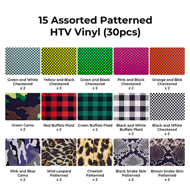 - Details: The bundle includes 30 pcs of 12" x 10" sheets in 15 assorted vibrant patterns. Beautiful checkered, buffalo plaid, camo, and animal patterns.
