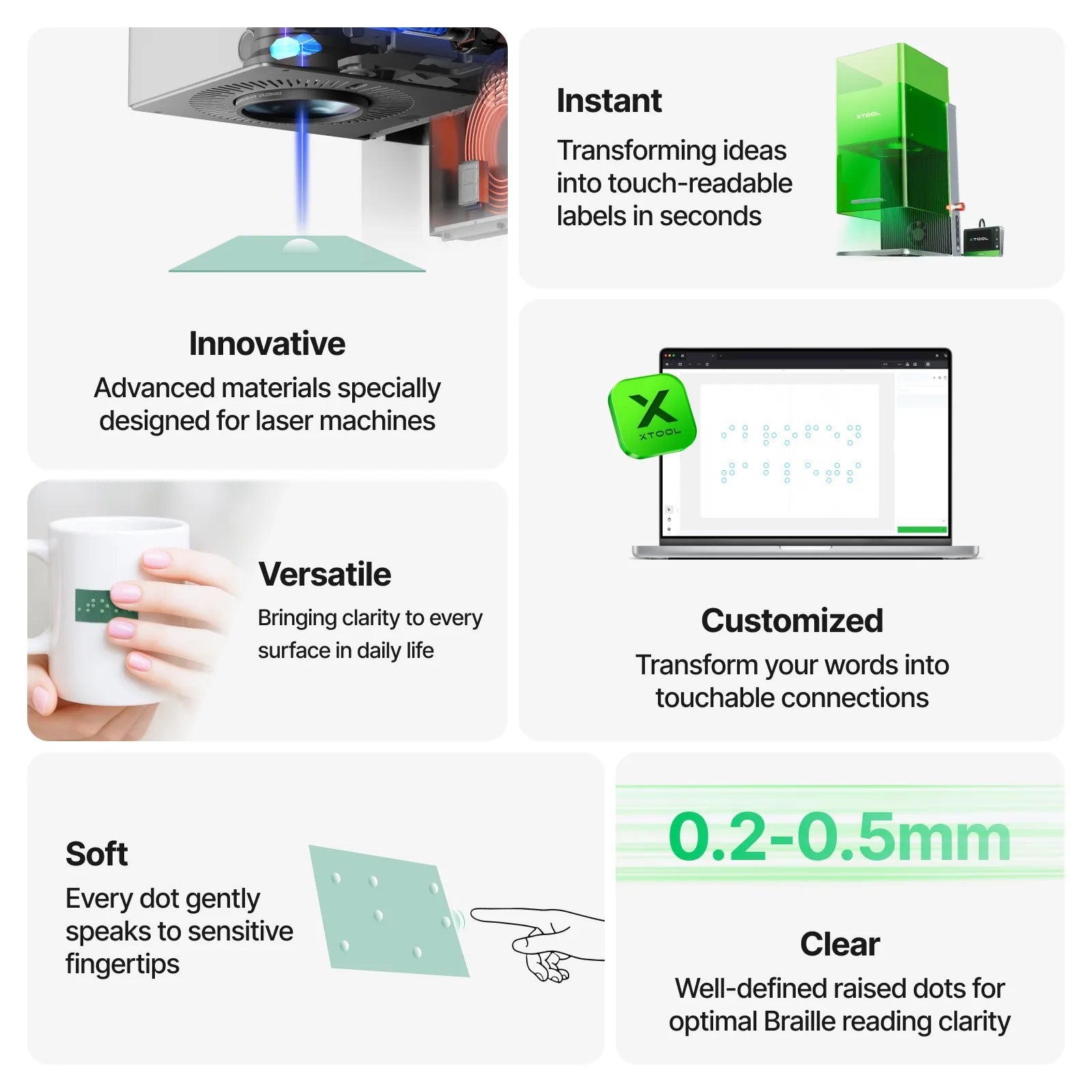 These stickers are designed for blind or visually impaired people for various occasions. With the soft touch and instant customization capabilities, our Braille stickers allow users to easily create tactile Braille in seconds with xTool F1 Ultra. This empowers individuals to incorporate Braille into their daily lives, ideal for classrooms, offices, or daily items like documents, appliances, or personal belongings.
