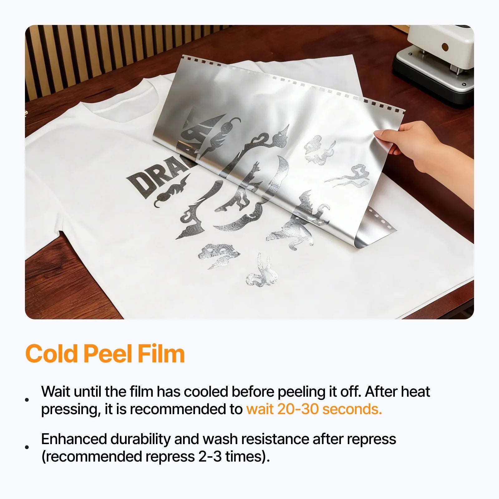 - This product is a cold peel film. Heat press at 160°C/320°F for 10 seconds. After hot pressing, it is recommended to wait 20-30 seconds for the material to cool before peeling off the film. Then re-press the completed transfer design using identical parameters. It is recommended to re-press the fabric 2-3 times to reduce the pattern from cracking or wrinkling after washing and drying.