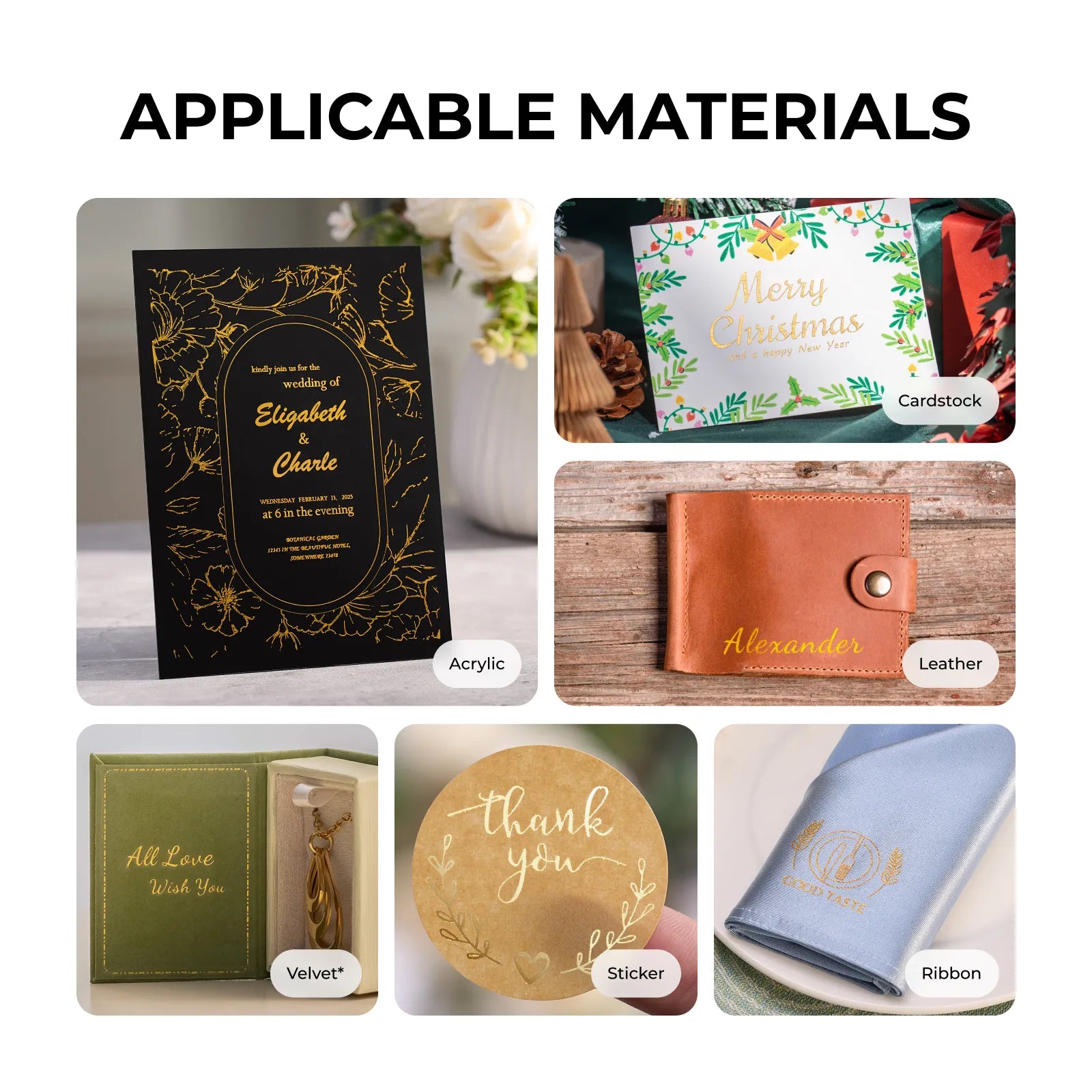- After multiple rigorous tests to ensure that it can be perfectly adapted to the xTool M1 Ultra Hot Foil Pen to achieve the best results, heat-activated foil transfers can be made on a wide range of materials, whether on paper, cardstock, leather, acrylic, or boxes for beautiful results.
