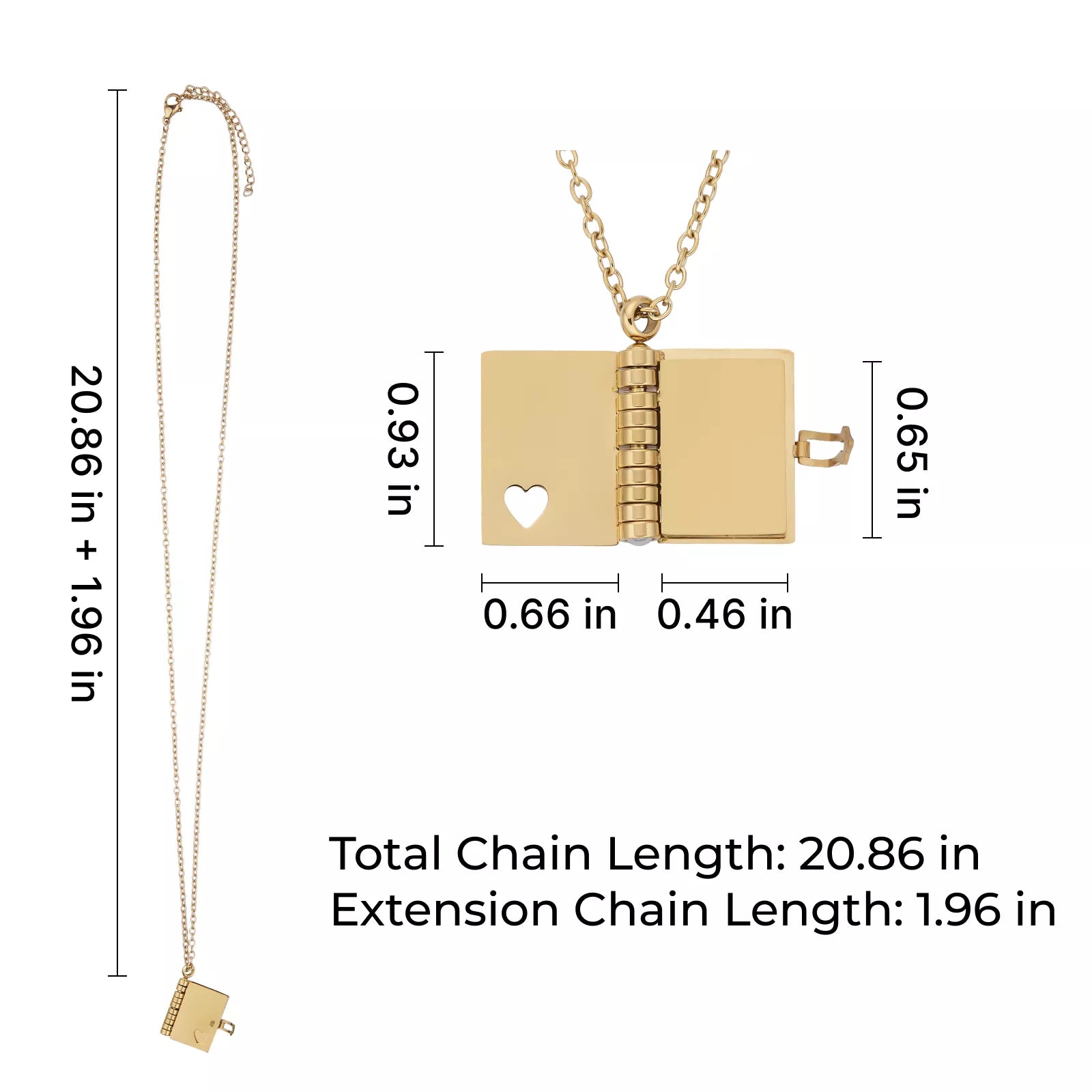 - Product DimensionThe book pendant size of 0.66"" x 0.93"" x 0.14"". The total chain length is 20.86 inches, with a 1.96-inch extension chain.