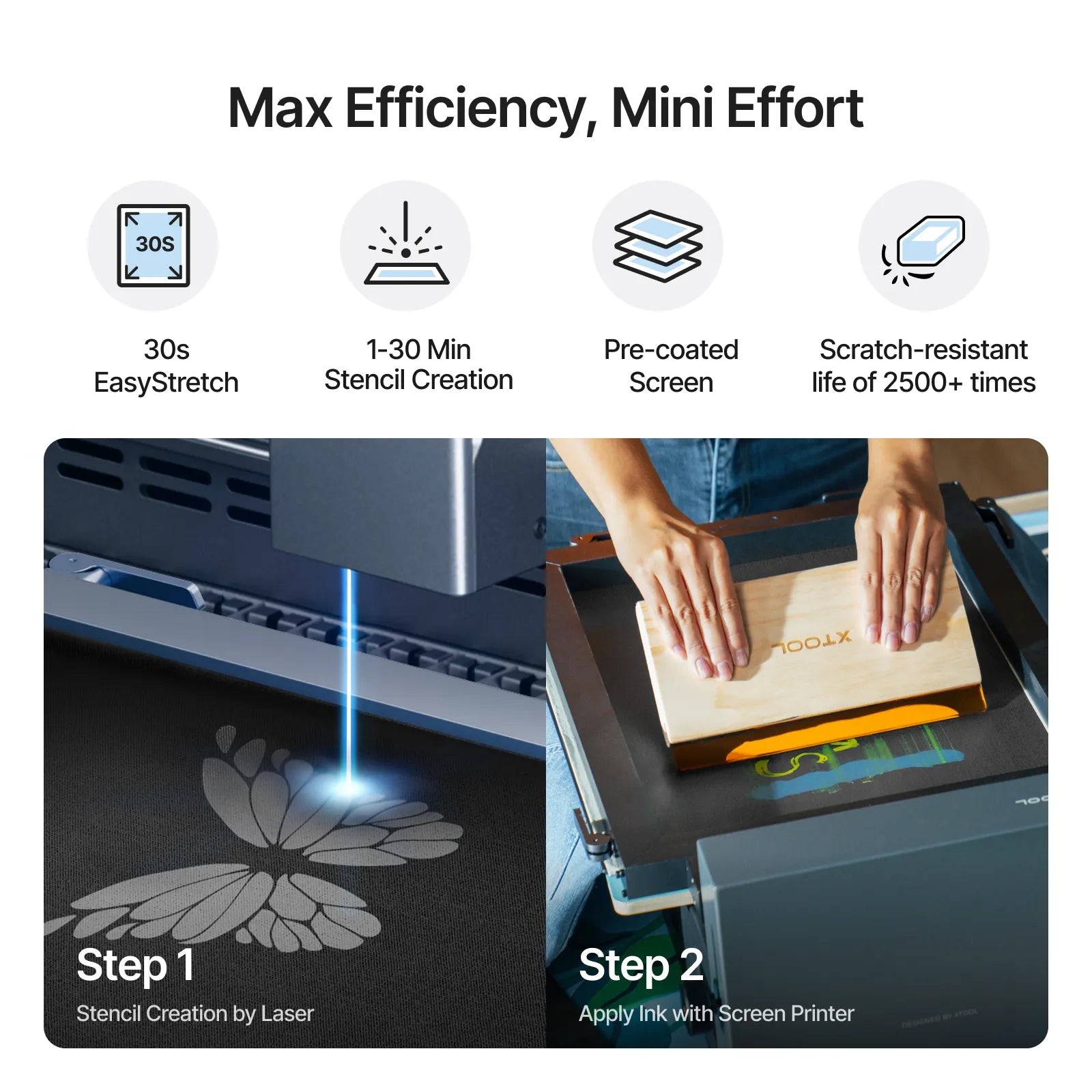 - Compatible with 292 mm x 406 mm coated screen only. Seamlessly compatible with the xTool Screen Printer and can be engraved by xTool machines when used with a coated screen, especially the xTool D/S1.