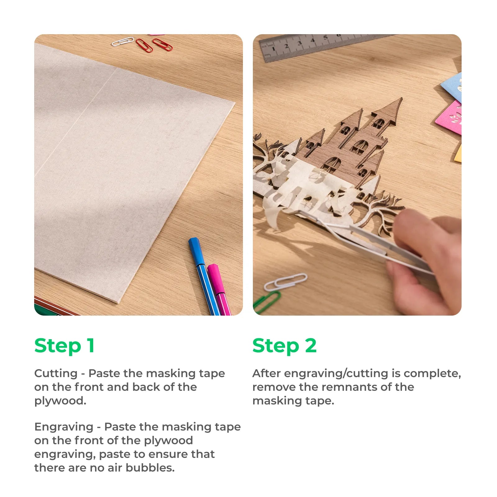 - Steps to use: need to be used before processing plywood. If you need to cut the plywood, you need to first give both sides of the plywood a label with masking tape, and then use the xTool machine for laser cutting. If you need to engrave the plywood, you need to put the masking tape on the front side of the plywood to be engraved, and then use the xTool machine for laser engraving. The best results are achieved by ensuring no air bubbles after applying the masking tape.