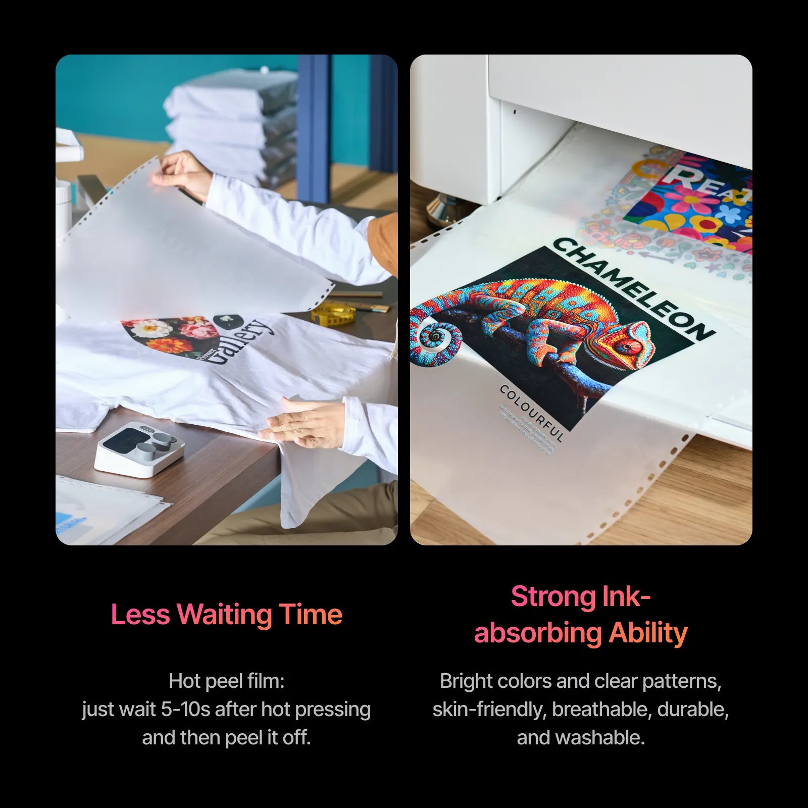 - Apparel printing should be processed at an operating temperature of 59-89°F / 15-30°C and an operating humidity of 30%-80% RH. For optimal print results, it is recommended that the working environment be maintained at an operating temperature of 68-89°F / 20-30°C and an operating humidity of 50%-80% RH. The hot pressing temperature of the film is 150°C-160°C, and the hot pressing time is 5-10 seconds.