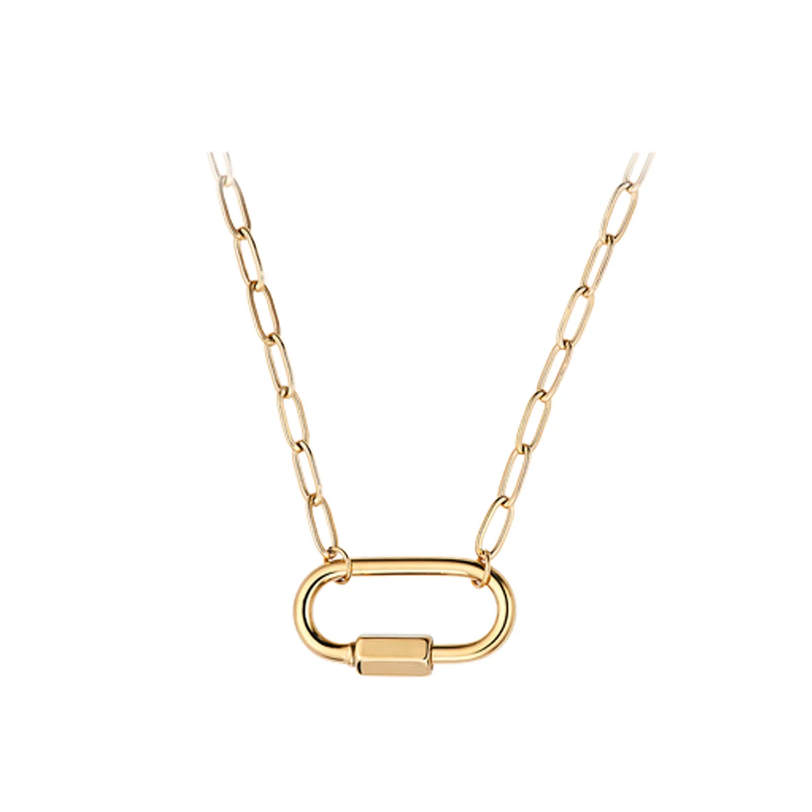 - Gold stainless steel carabiner necklaces are 18K gold-plated stainless steel, strong and durable. An extension chain can be sized to suit individual needs.