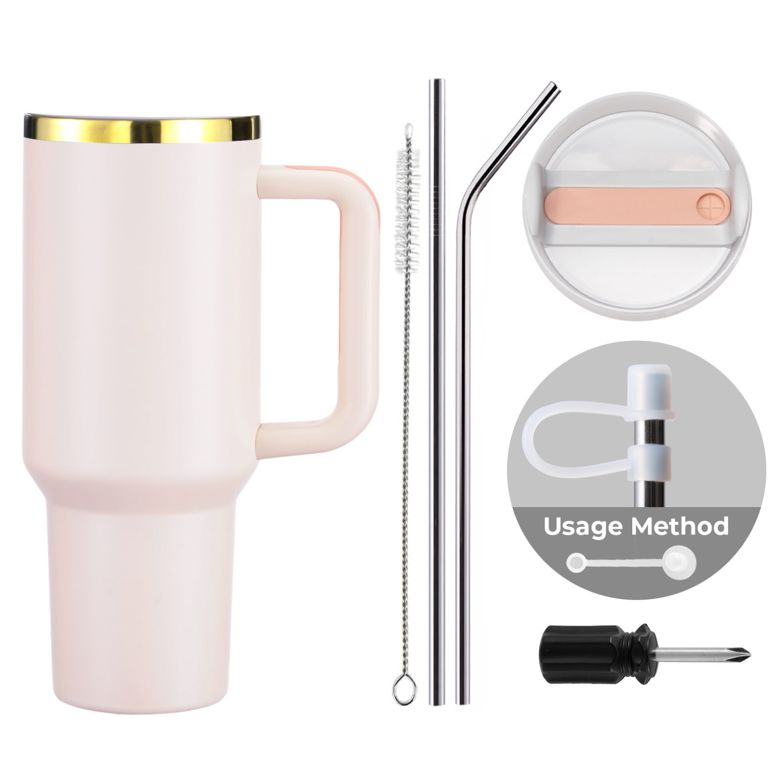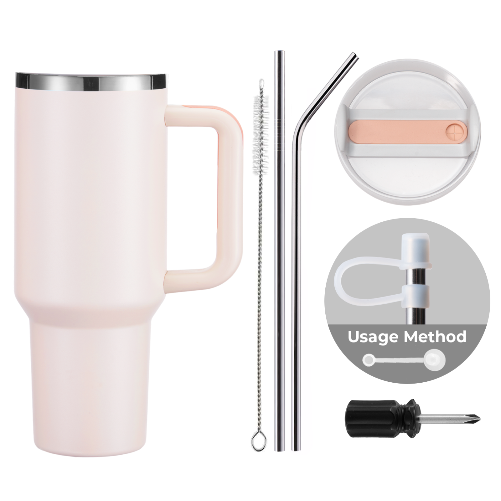 - Each tumbler has two stainless steel straws, silicone straw tips, and a complementary screwdriver that facilitates the disassembly of the handle for engraving on the cup body. A straw brush is only provided with the purchase of the yellow and pink stainless steel tumbler.