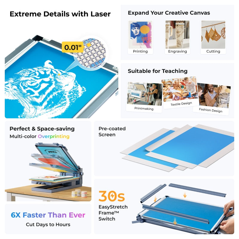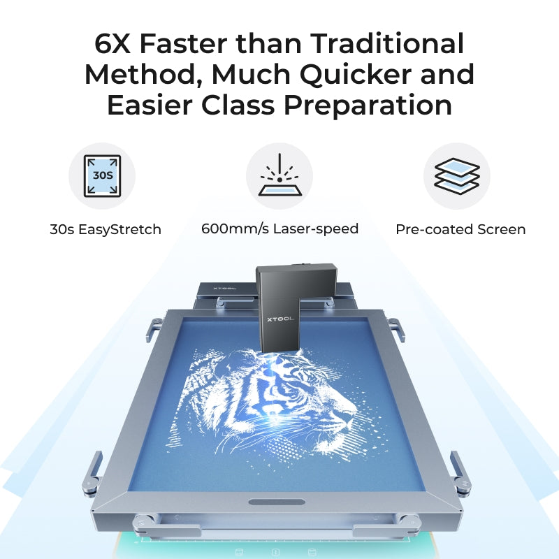 Using 4 integrated tensioning strips and 6 quick-pull wrenches, xTool’s groundbreaking EasyStretch design simplifies the screen stretching process to an amazing 30 seconds! It also ensures uniform tension and allows for quicker and more convenient screen swapping.