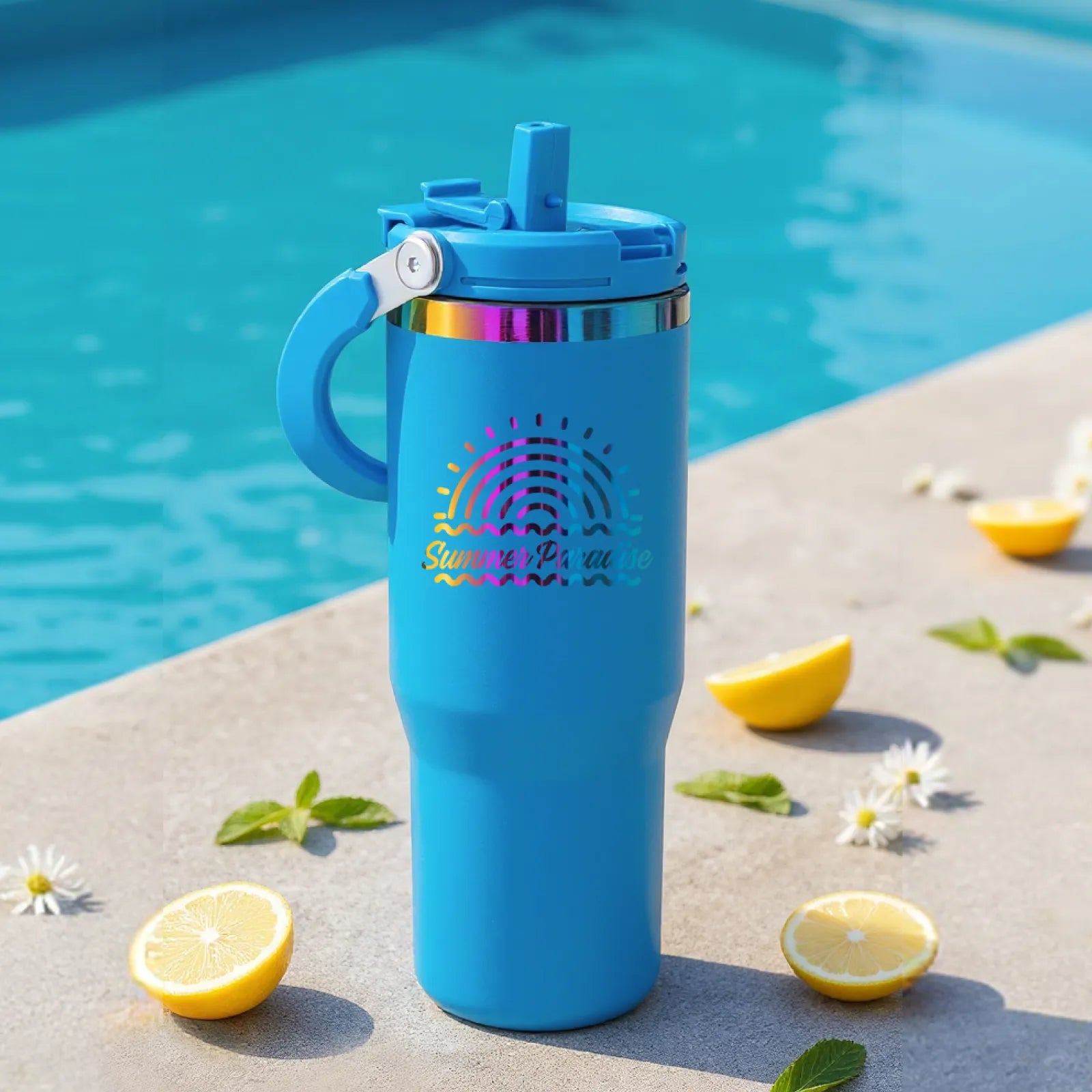- Meets the needs of users in various scenarios. The large capacity ensures continuous hydration during exercise, and the portable handle supports activities such as hiking and cycling for extended periods. Whether you're at home, in the office, at the gym, or enjoying outdoor activities like picnics or beach days, this tumbler's 0,89 L capacity ensures you stay hydrated in style.