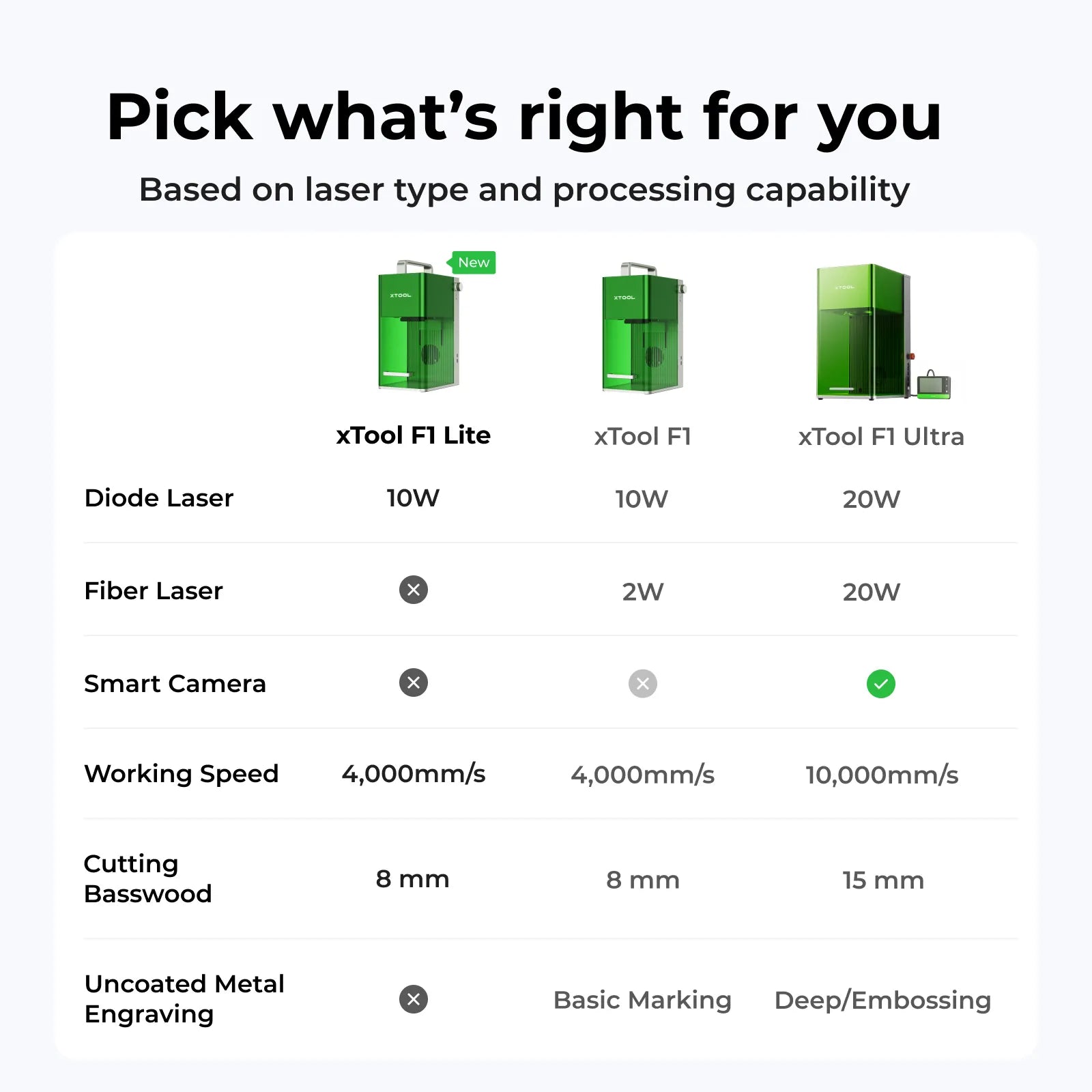 xTool F1 Lite only features a 10W diode laser, while xTool F1 features a dual-laser system, including both a 10W diode laser and a 2W infrared laser. As a result, xTool F1 can additionally engrave plastics and more metals, such as gold, silver, brass, platinum, and more.