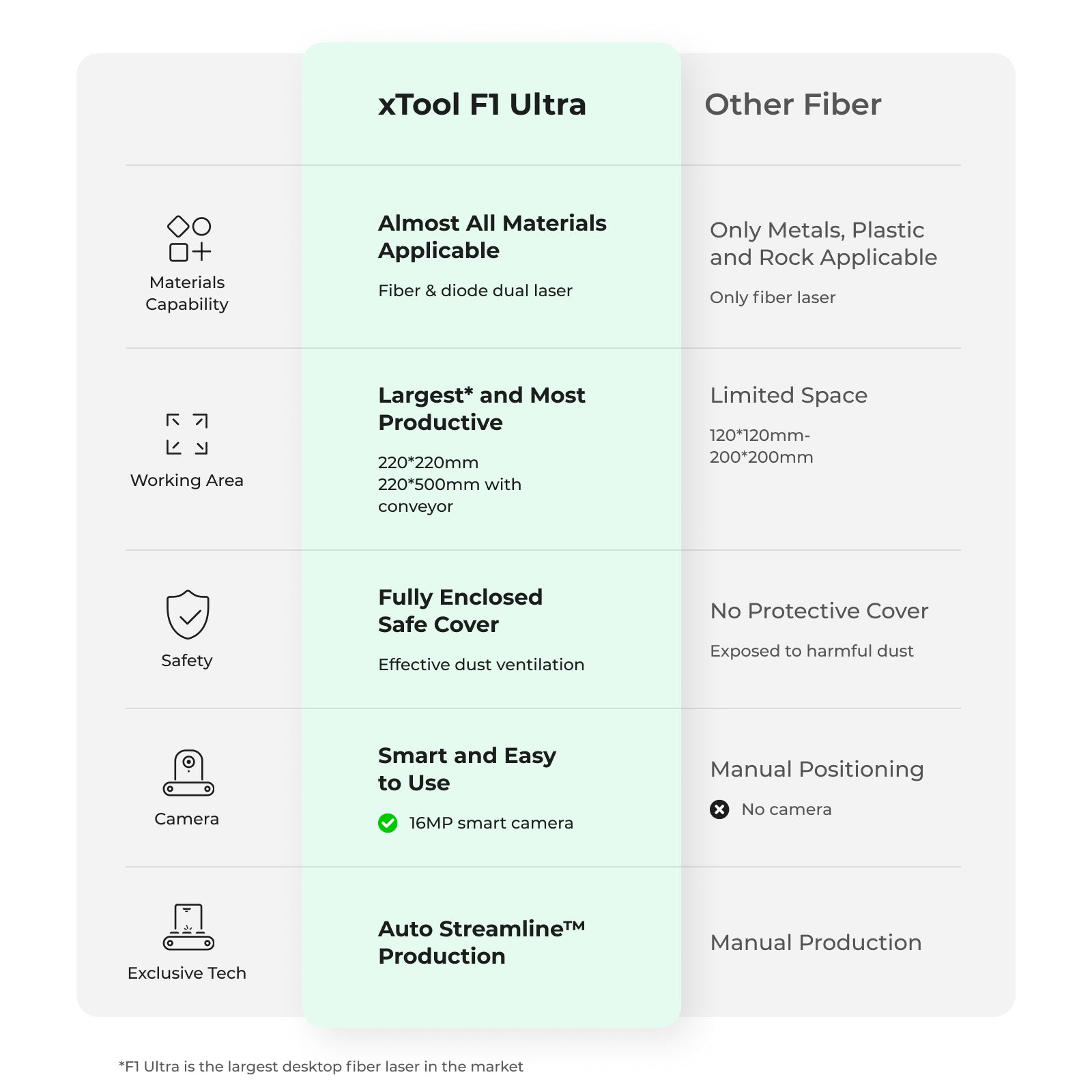 And yes, F1 Ultra is a true fiber. The F1 Ultra uses an IR (infrared laser) as its laser source, while the fiber (diode-pumped fiber laser) serves as the gain medium. Both are essential components for generating laser light.